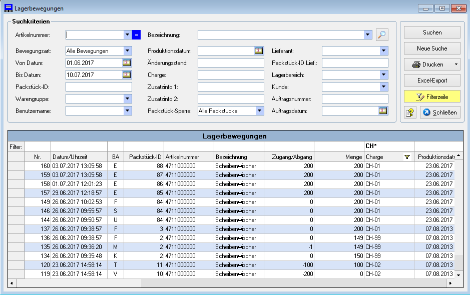 Die Infodialoge Packstückbestand und Lagerbewegungen wurden mit einer zusätzlichen Filterzeile ausgestattet. Während bisher über die Suchkriterien nur die exakte Suche möglich war, unterstützt die Filterzeile auch die Wildcard-Suche (Feld beginnt mit, Feld enthält) sowie Größer-Kleiner-Bedingungen (z.B. Menge < 100 oder Produktionsdatum älter als 01.01.2017).