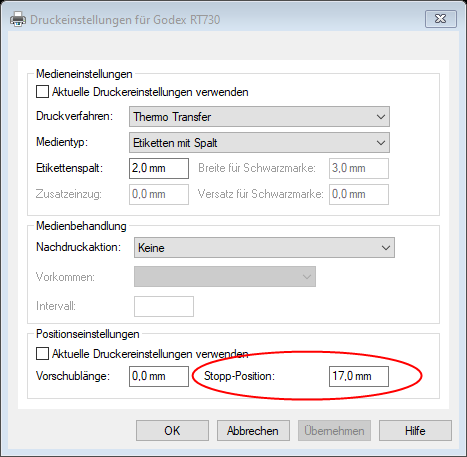 Sollte dies nicht helfen, können Sie im Druckertreiber (Seagull) einen zusätzlichen Vorschub einstellen, der die Position der Abrisskante bestimmt. Sie finden die Einstellung im Register "Etikett" unter "Stopp-Position". In diesem Beispiel wird ein zusätzlicher Vorschub von 17 mm eingestellt: